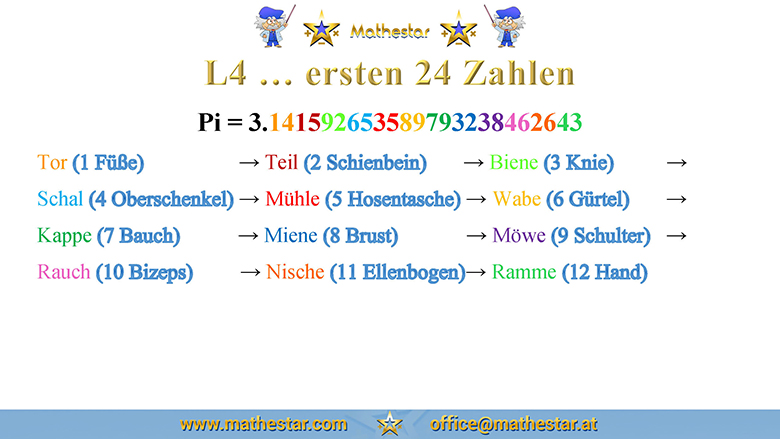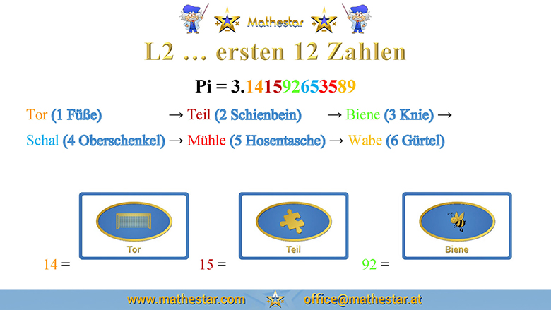 Zurück Übungsphase Erwachsene Das Major - System Anwendung - Pi = 3,14159265... AUSWAHL