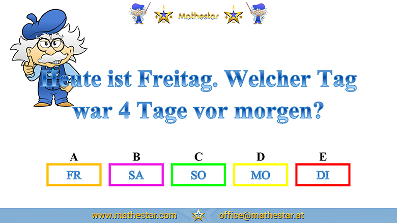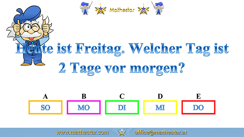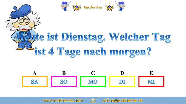Zurück Übungsphase 4.Schulstufe Gehirnjogging Welcher Wochentag? AUSWAHL